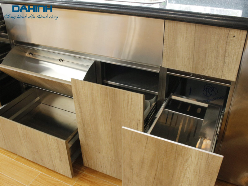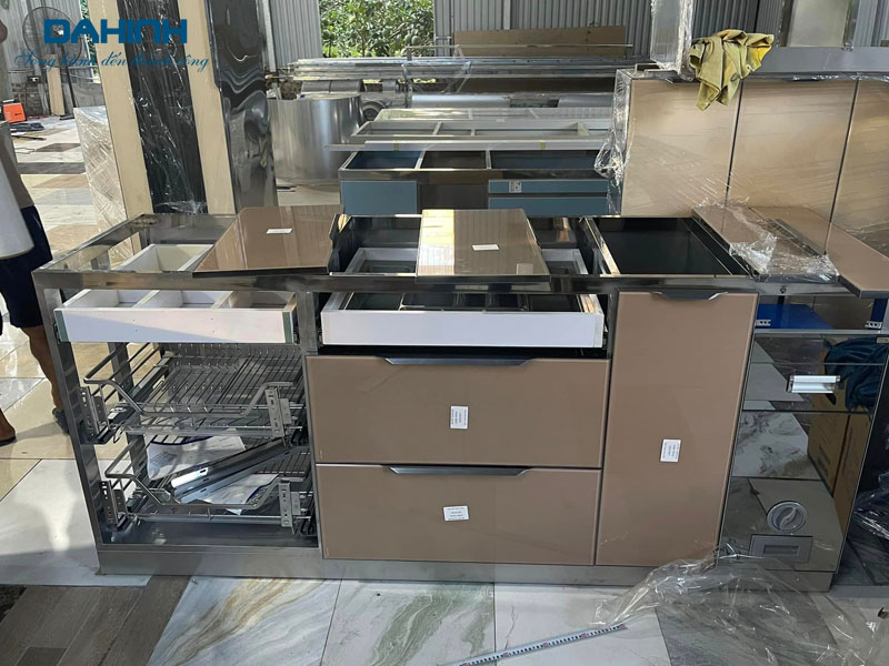 – Khung và thùng tủ bếp: thường làm bằng chất liệu inox 304 cao cấp chống gỉ hiệu quả.