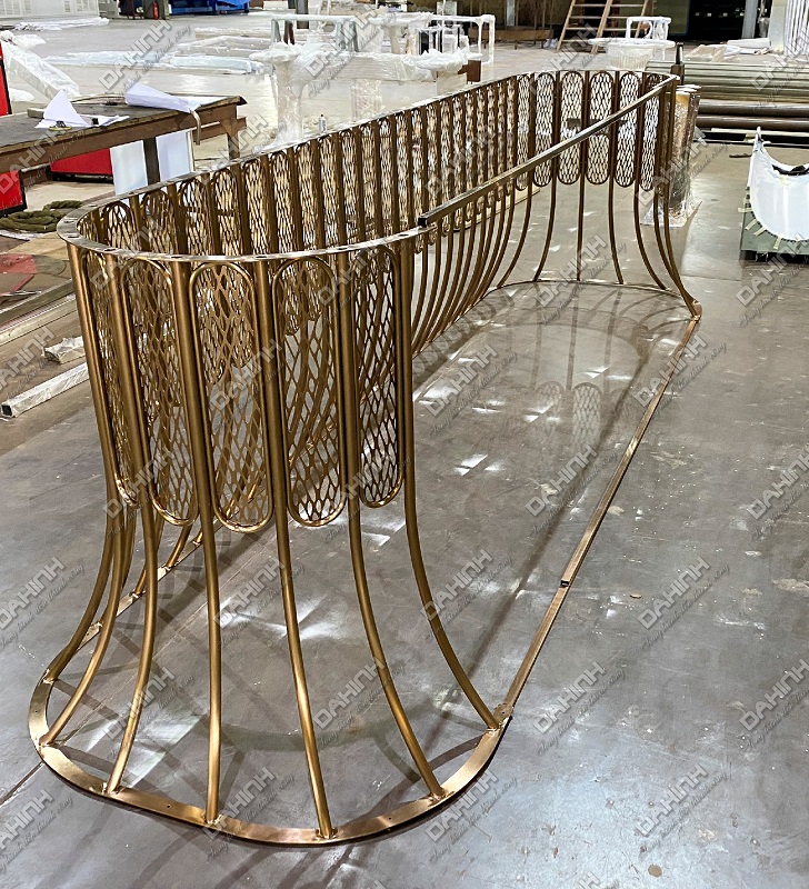 Khung quầy lễ tân inox mạ vàng mang trong mình vẻ đẹp lộng lẫy, quý phái của sắc vàng ánh kim, kết hợp hoàn hảo với sự bền bỉ và sáng bóng của chất liệu inox cao cấp.