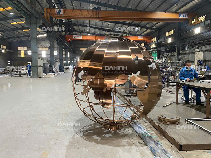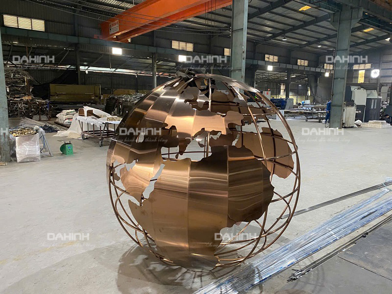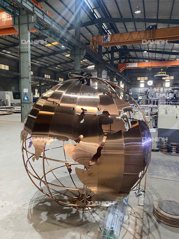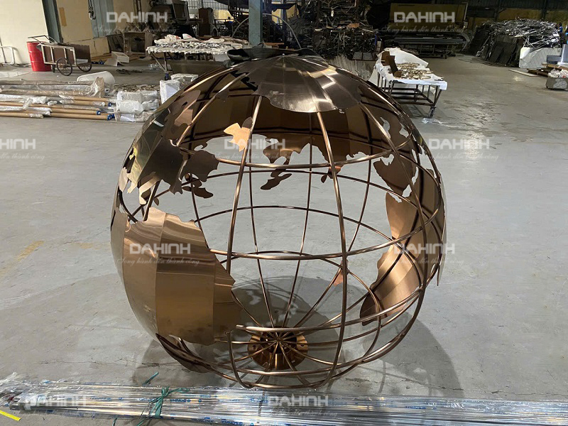 Quả cầu inox mạ vàng với tạo hình bản đồ thế giới đang trở thành lựa chọn hàng đầu cho các sảnh tòa nhà, công viên trung tâm và biệt thự sang trọng.