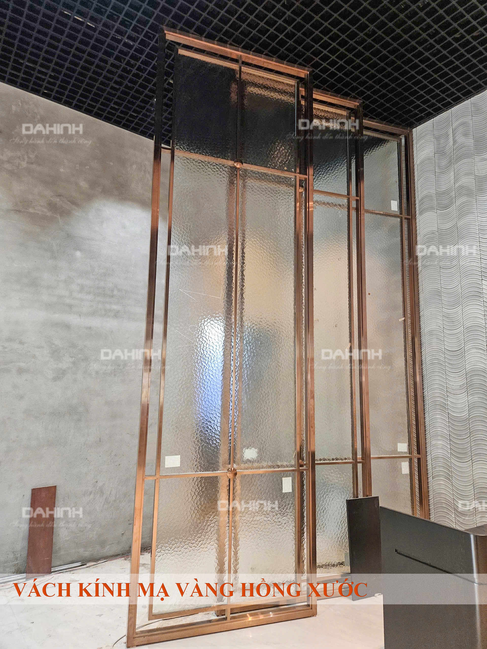 Vách kính ngăn phòng làm việc khung inox mạ vàng hồng