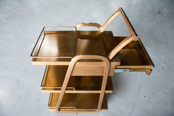 Mẫu xe đẩy 3 tầng inox 304 mạ vàng cao cấp này được dùng để làm xe đẩy thức ăn nhà hàng, khách sạn, dụng cụ y tế, đồ dùng trong spa, thẩm mỹ viện cao cấp. Sử dụng mẫu xe đẩy thức ăn nhà hàng này giúp bạn phục vụ khách hàng một cách nhanh chóng và thuận tiện. Đồng thời tăng hiệu suất làm việc và mang lại sự sang trọng cho không gian kinh doanh.